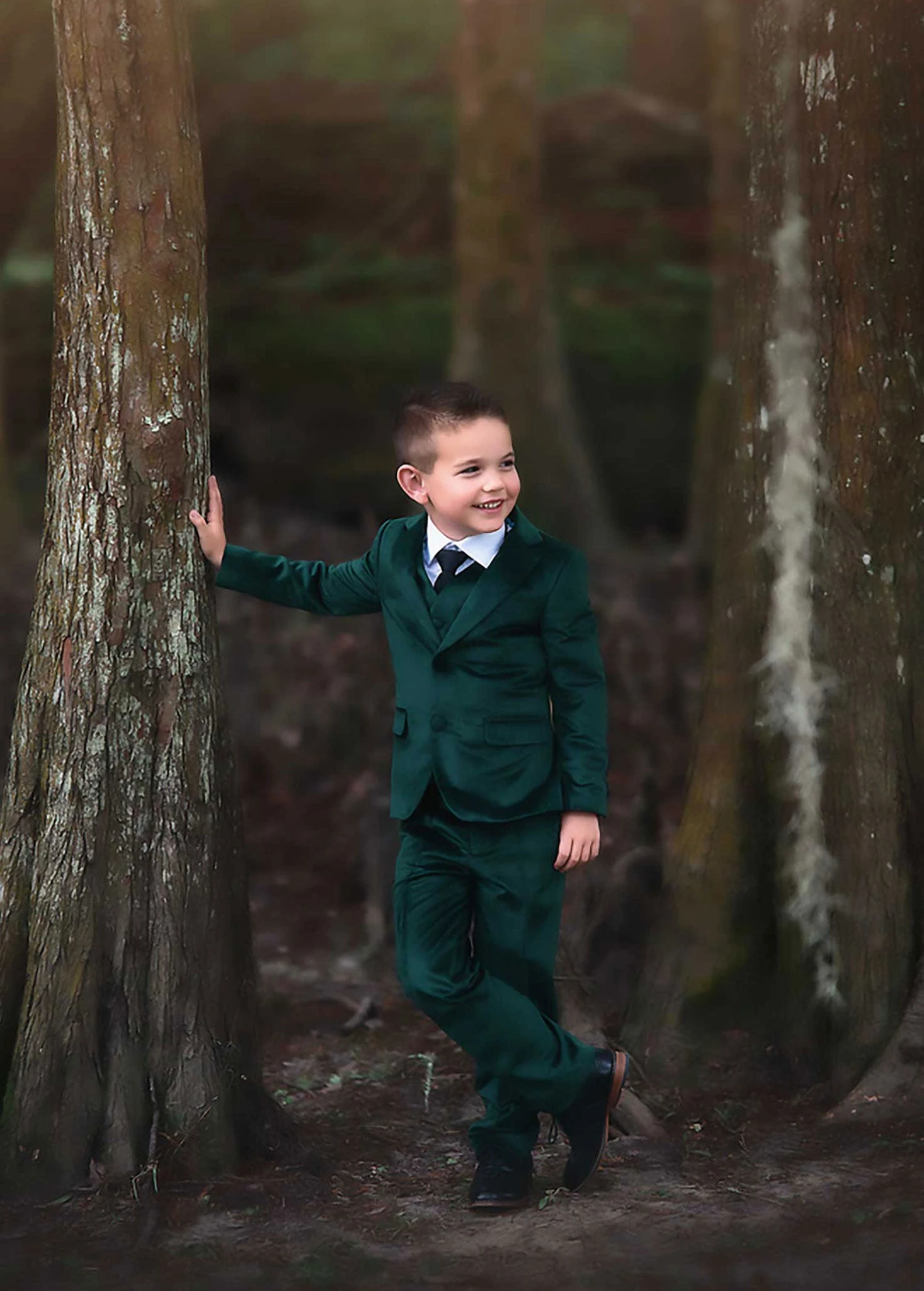 The quality is amazing on these, and for 3 pieces it’s a steal of a deal. Jacket, pant and vest will be coming to you, packaged beautifully on a hanger and in a keepsake suit bag. This luxurious emerald velvet suit is fully lined and finished just as beautifully on the inside as the out. This jacket has 2 hidden pockets to keep his special keepsakes. Vest has an adjustable back buckle and pant comes with adjustable elastic tabs inside, for just the right fit. 70% poly 30% cotton, 100% poly lining. Dry clean only. Model is wearing a size 5 and is 5 years old. These run true to size.